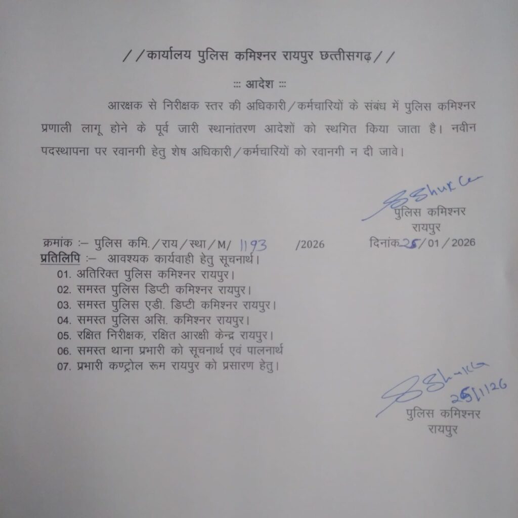 रायपुर में पुलिस आयुक्त प्रणाली लागू होने के बाद पुलिस कमिश्नर डॉ. संजीव शुक्ला ने बड़ा प्रशासनिक निर्णय लिया है। उन्होंने थाना-प्रभारी से लेकर आरक्षकों तक के तबादला आदेशों को स्थगित कर दिया है। यह आदेश राजधानी में नई पुलिसिंग व्यवस्था को स्थिर और प्रभावी बनाने के उद्देश्य से जारी किया गया है।